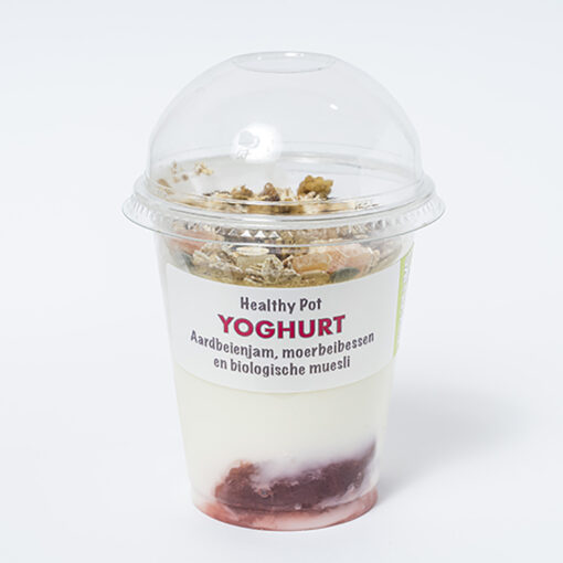 Yoghurt met aardbeienjam, biologische muesli en moerbeibessen